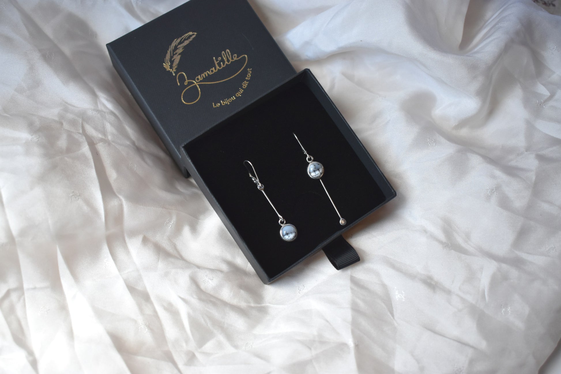 "Les Filantes" sont des boucles d'oreilles uniques faites artisanalement en argent massif et des merlinite (opale dendritique)